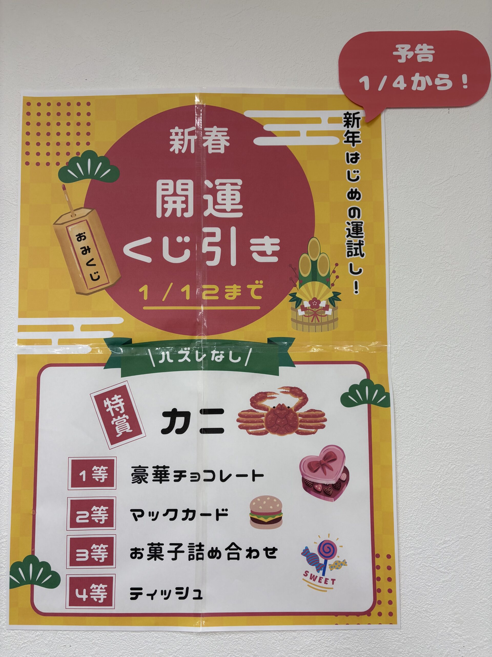 年明けの1/4(日)〜12(月)まで、新春開運くじ引きを開催します!