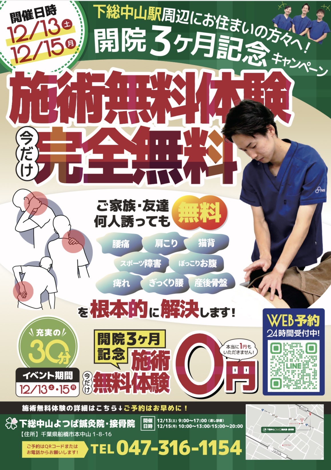 腰痛、肩こり、頭痛、姿勢不良など、お身体でお困りのある方はこの機会にぜひ治療を受けてみてください!