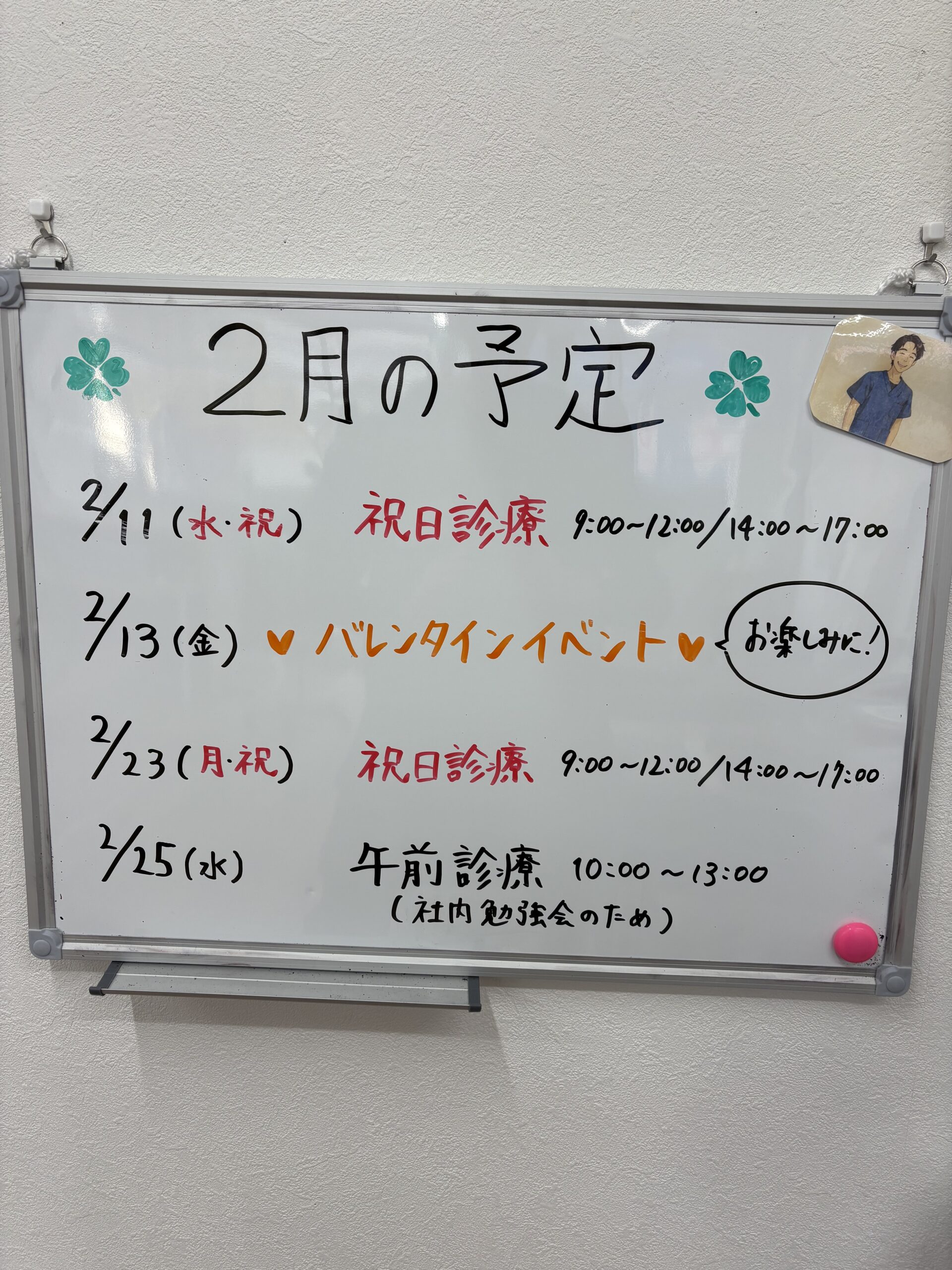 2/11(水祝)診療してます! 2026 2/10 ブログ February 10, 2026 こんにちは! 2/11は祝日ですが、診療しております! 受付時間は、9時〜12時/14時〜17時 です! 週の真ん中に治療して、良い状態を作りましょう😄 お待ちしております🍀 ブログ よかったらシェアしてね! URLをコピーしました! URLをコピーしました!
