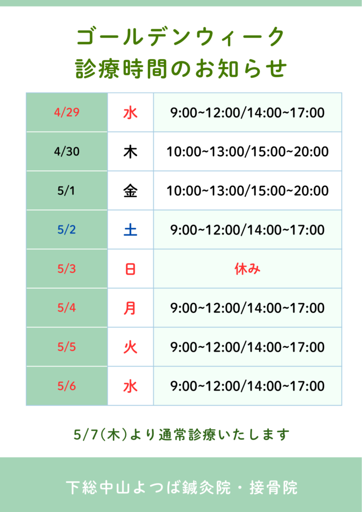 こんにちは!下総中山よつば鍼灸院・接骨院です🍀